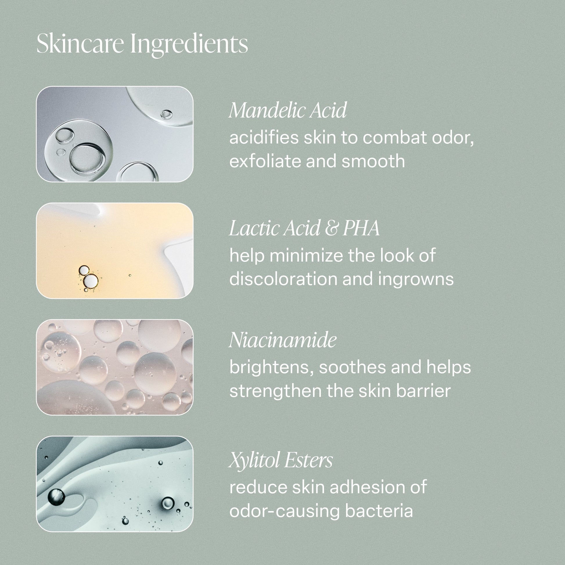 Our serum deodorant is formulated with a multi-acid blend of mandelic, lactic and polyhydroxy that acidifies the skin to combat odor, brighten the look of discoloration, and smooth and reduce the look of ingrowns. Clinically proven to combat odor for 48 hours.